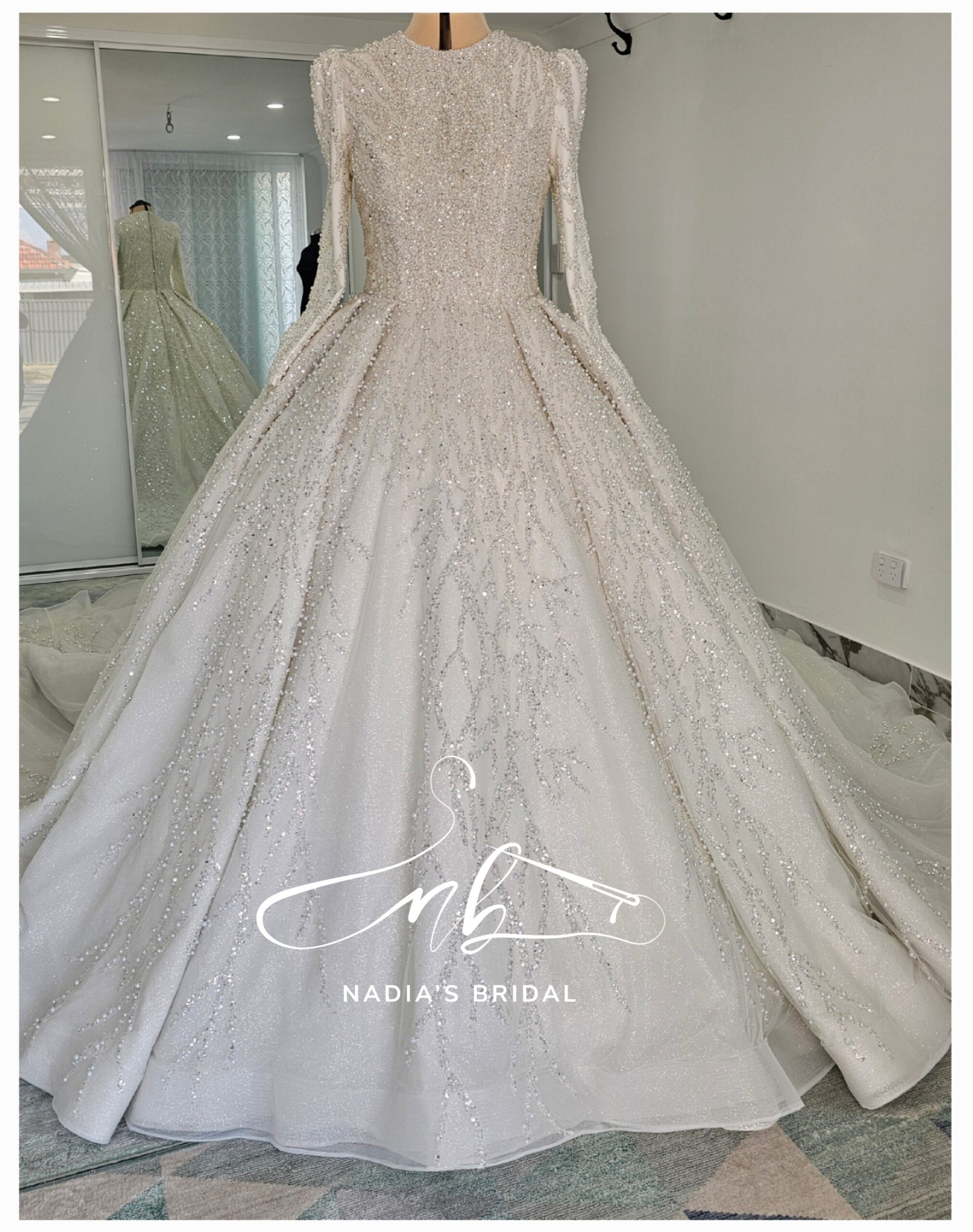 Custom Made Off White, full beading, Luxury Wedding dress. Top quality fabric beaded with lots of Swarovski Crystals, Rhinestones and Pearls. Available size 14 and can be customised to your measurements.